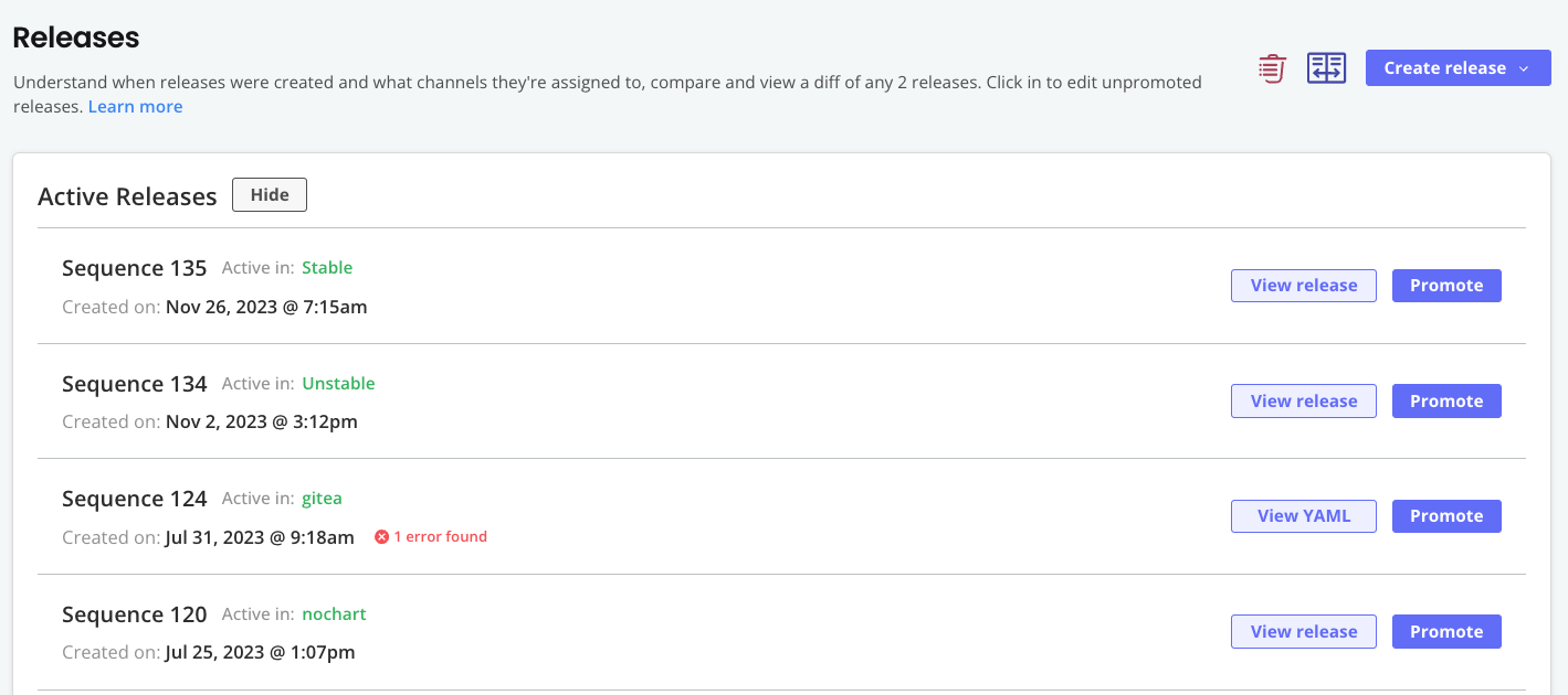 You can archive releases to remove them from view on the Releases page. Archiving a release that has been promoted does not remove the release from the channel's Release History page or prevent KOTS from downloading the archived release.